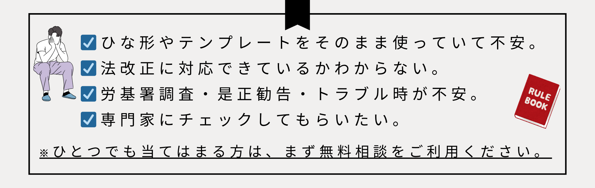 法改正未対応の就業規則は、是正勧告やトラブルの原因になります。