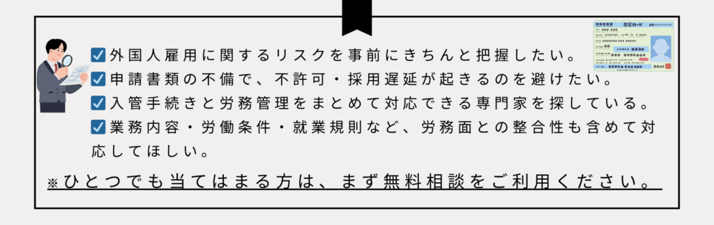 不許可リスクの洗い出し|労務周りも事前にチェック|在留資格手続き×労務環境整備まで対応。