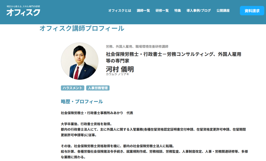 ※ストリートアカデミー株式会社が運営する法人研修サービス「オフィスク」の講師として登録されており、労務・外国人雇用・職場環境改善に関する法人研修も行っています。